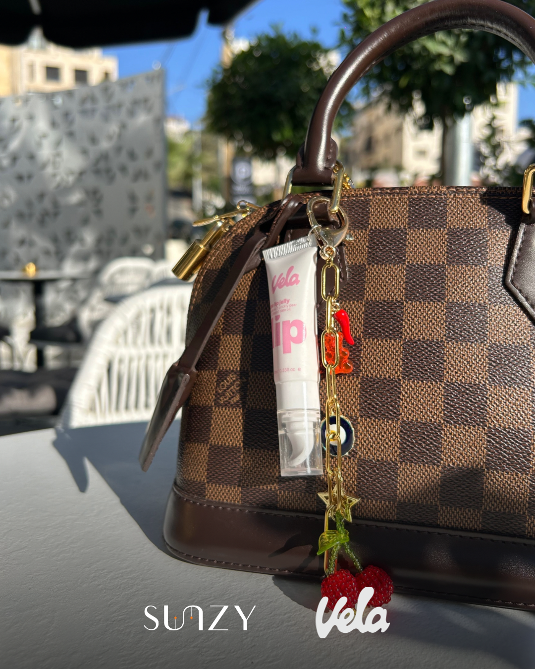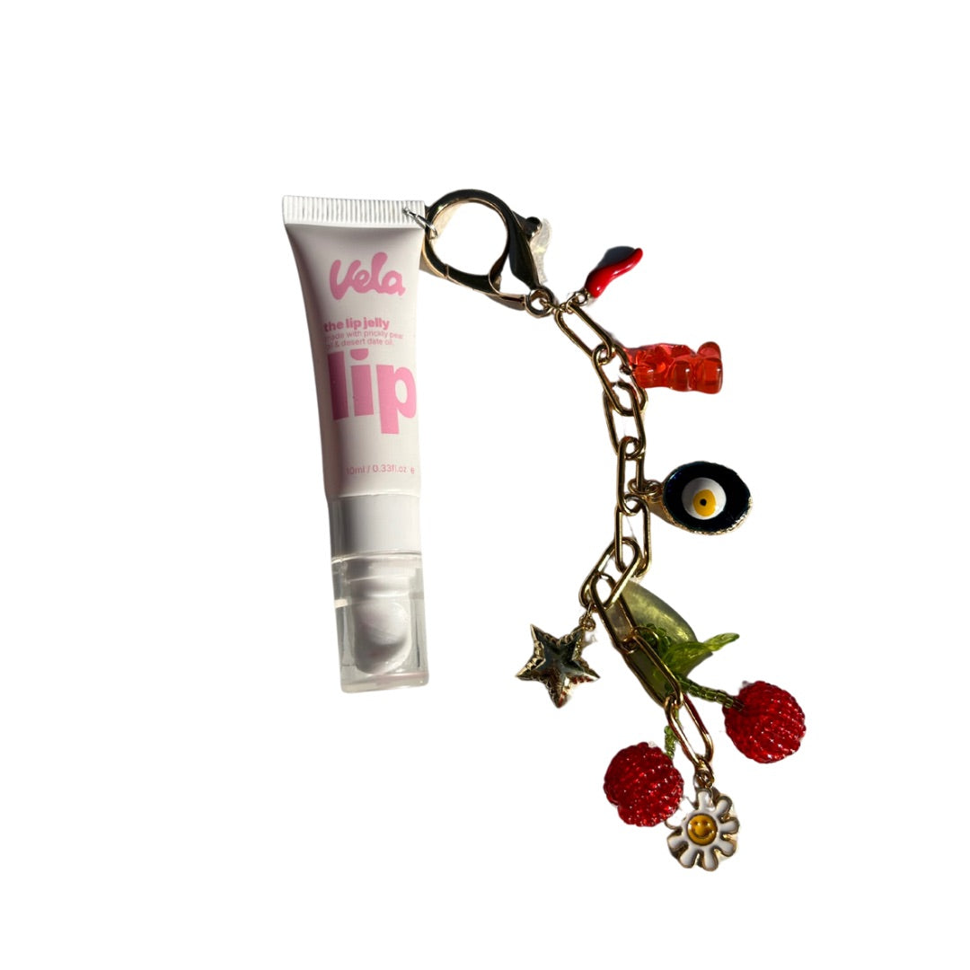 Vela lip jelly with a golden chain charm with pendants