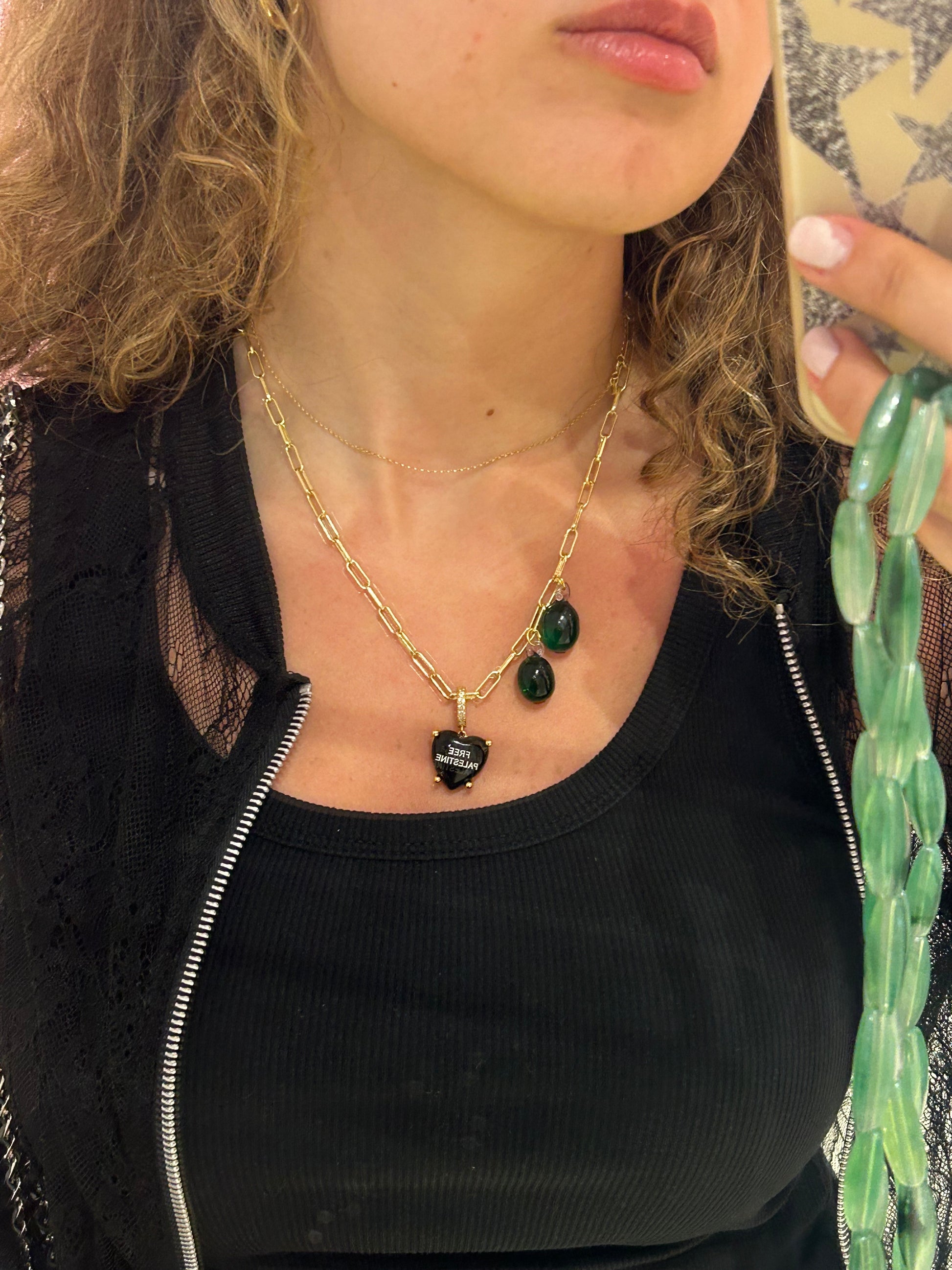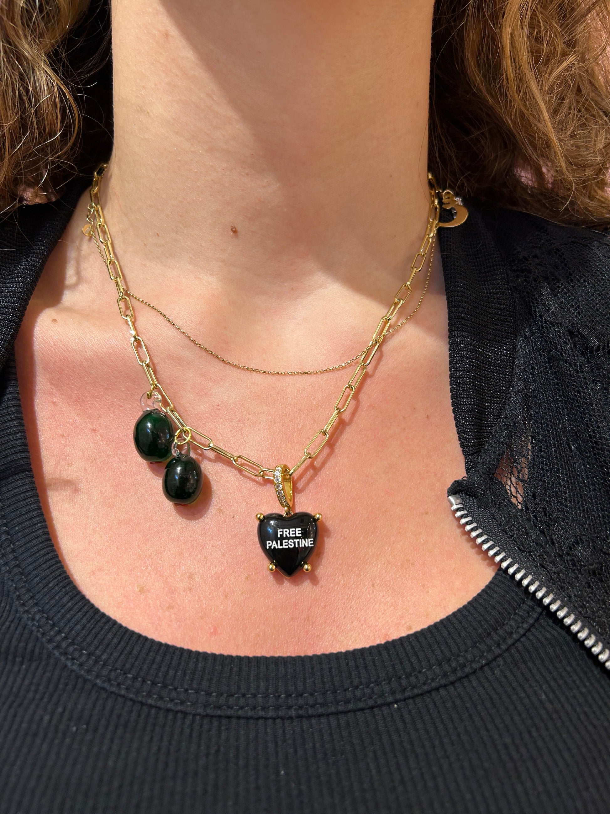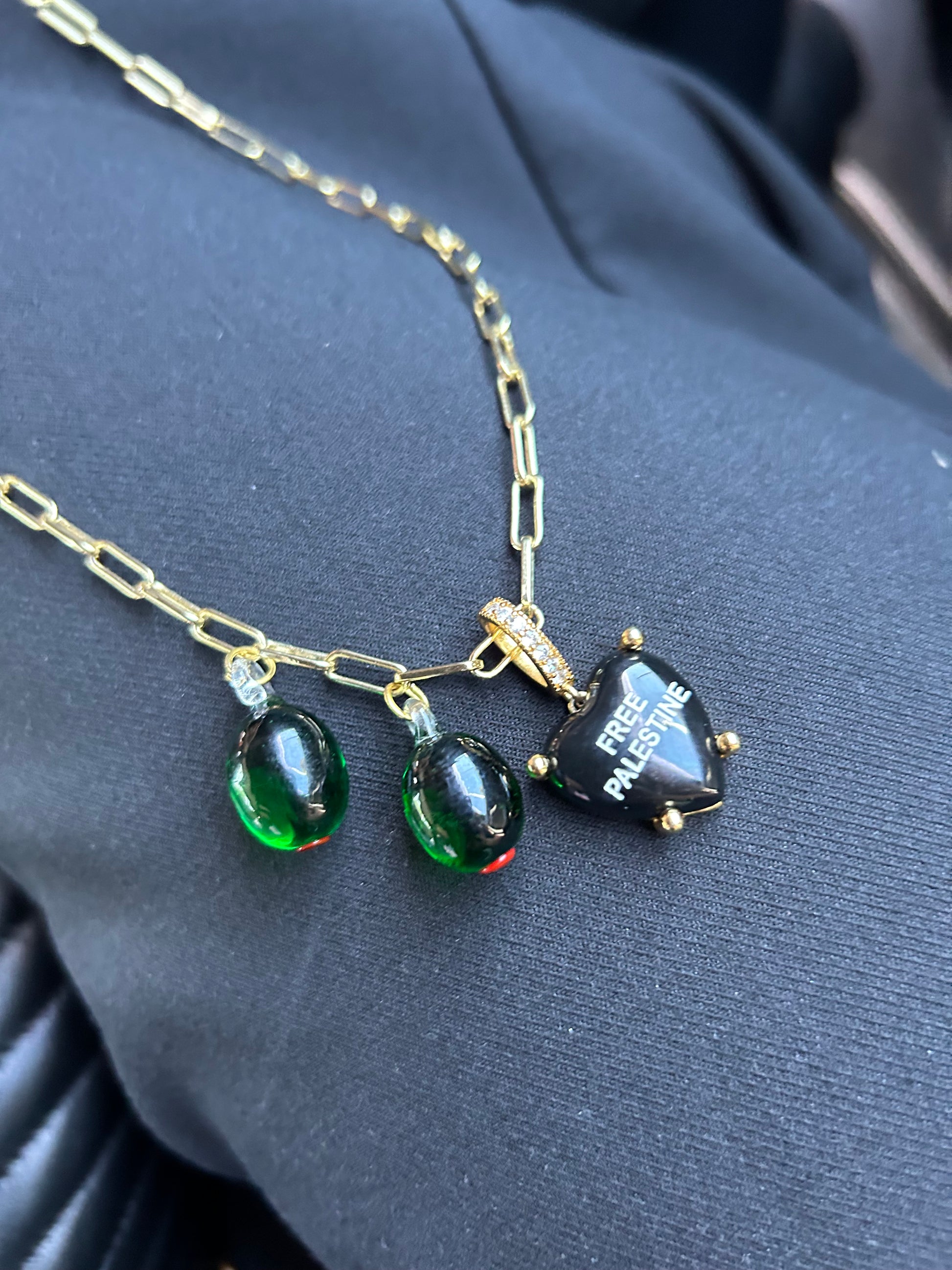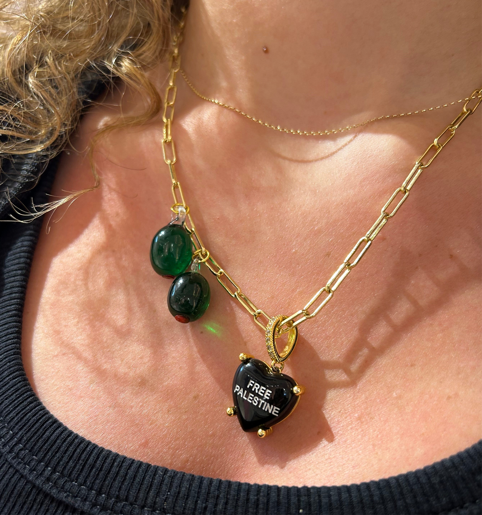 Gold plated chain with a free Palestine heart and 2 glass olivesΒ